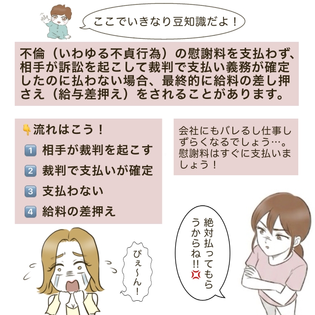 🌟ちなみに、カナが訴訟を起こして裁判で支払い義務が確定したのに慰謝料が払われなかったら、ルリ子の給料を差し押さえすることも可能です!やっぱり不倫はリスクしかないよね…😂